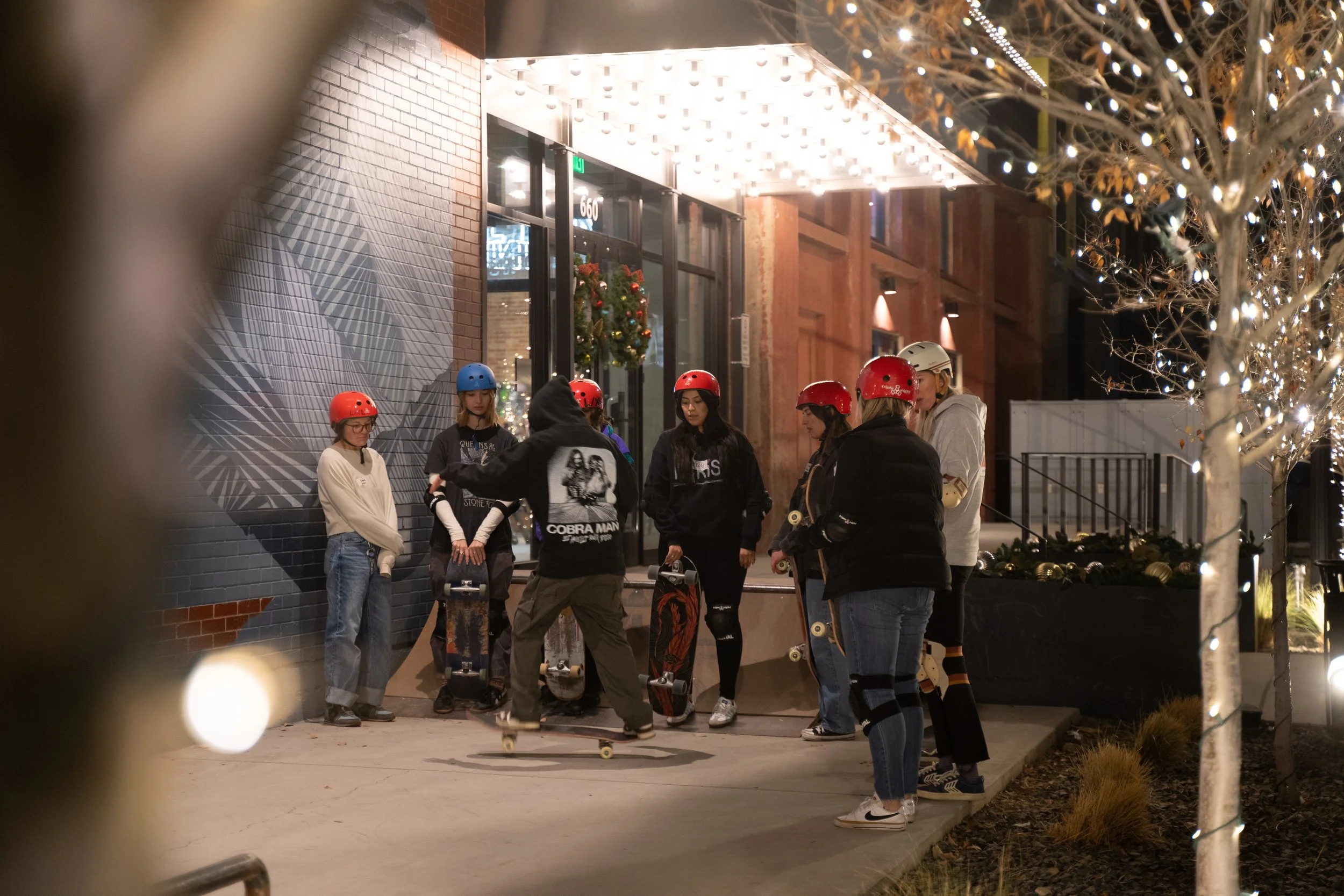Skate + Meet is a program designed for those looking to get into skateboarding or those looking to progress their skating. They are composed of an hour long lesson, followed by an open skate session. After skating, we head up to the bar and cheers to the evening.